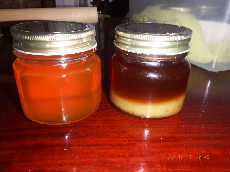 左が、今年のフローハイブからの、カラスザンショウの単花蜜ですね。右のが、カラスザンショウが多く含まれている、標高550mの蜂置き場の巣箱からの蜂蜜(8月15日採蜜)ですね。最初の色は左と同じですね。メイラード反応後が右ですね。