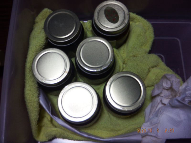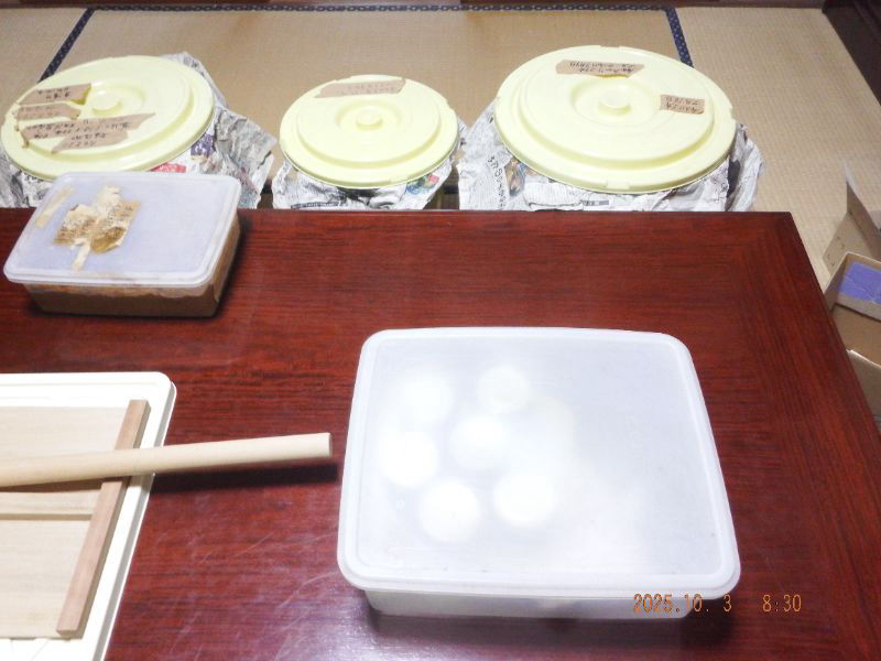手前のタッパーに入れたまま、常温でお縁に置いたままでしたね。奥の樽(3個)は奈良漬けで、白瓜・キュウリ・ゴーヤ、4~5年物になりますね。