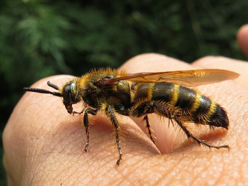 onigawaraさん こんばんは。 ハラナガツチバチだと思ったのですが、ネット図鑑で調べると、キンケハラナガツチバチというツチバチが一番合っていると思われます。しかも、九州にも生息してるようですし、10月まで活動しているようです。腹長で、毛が金色だからの名前だと思います。