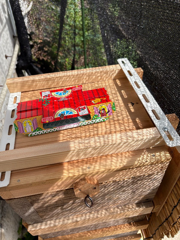 ミツバチが強群で活発なら、今の時期は天井の上にゴキブリホイホイを置いています。この上から板とトタン屋根が乗ります。