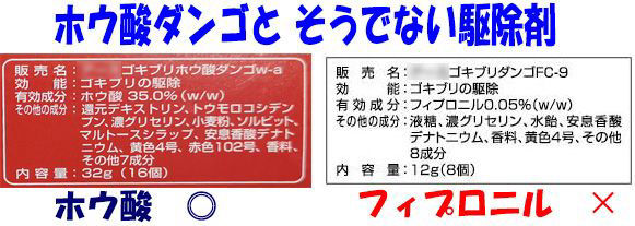 上記の製品は、両方とも同じ会社から出ているゴキブリ駆除剤ですが、左の赤いラベルは、ホウ酸ダンゴです。