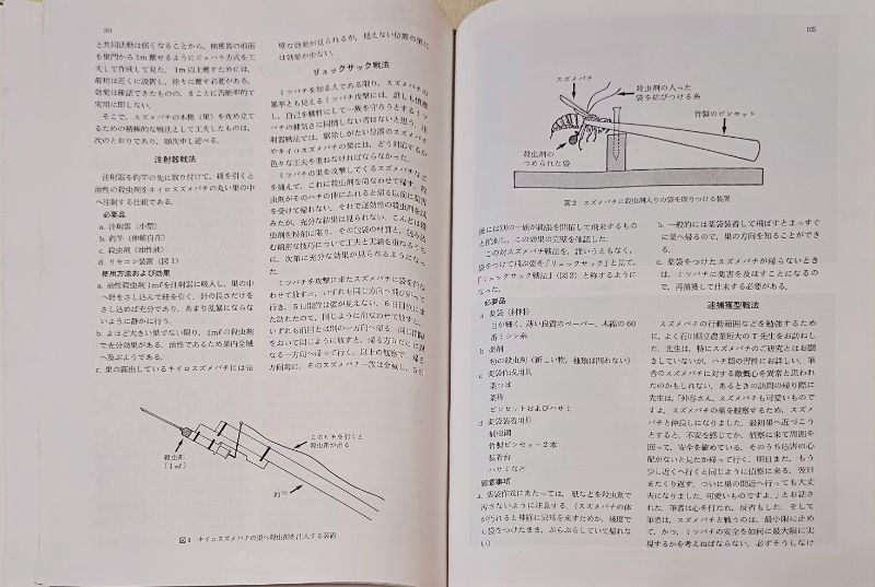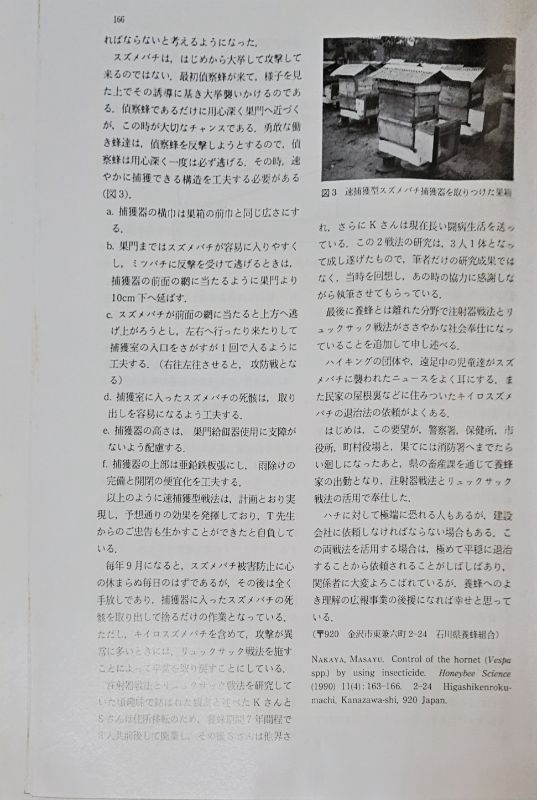 スズメバチトラップにかかった蜂をピンセット?で固定し、胸と腹の間のくびれに糸の先の輪を縛り、ティッシュの小さな切れ端で包んだ粉末殺虫剤(当時はまだDDTが販売されていた)を糸の反対の先に縛り付け、蜂を放して巣に持ち帰らせるという方法でした。