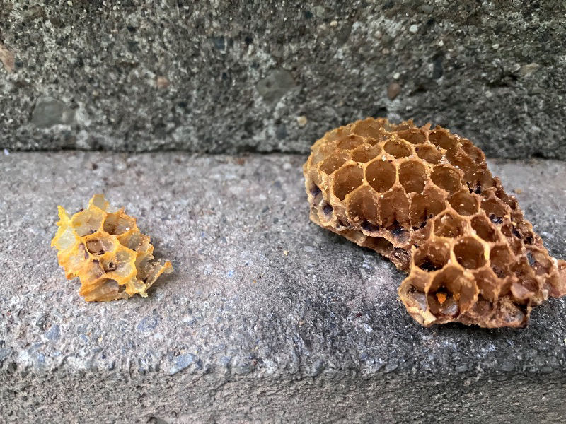 直近内見時に蜂たちがかじり落としただろう巣板があり、スムシが若干おりました。ただ「スムシっ子カード」を9月に新しいものに入れ替えてますので、かじりおとしたあとにスムシがたかっていたものと思います。