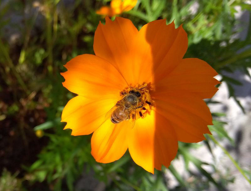 一般的なコスモスとキバナコスモス、どちらの訪花も見たことはありますが、たまたまか西洋ミツバチでした。