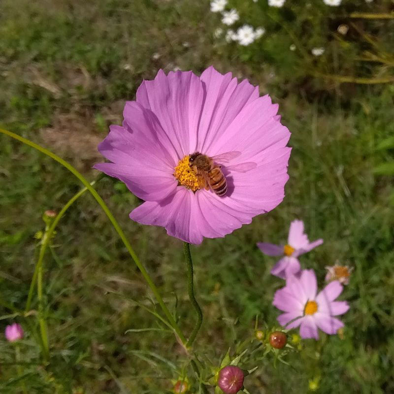 写真も添付いただきまして嬉しく思います。やはりコスモス綺麗ですね。秋風にヒラヒラと舞う浮遊感が魅力です。皆さんのご回答を拝見するとミツバチの訪花はキバナコスモスが優勢ですね。