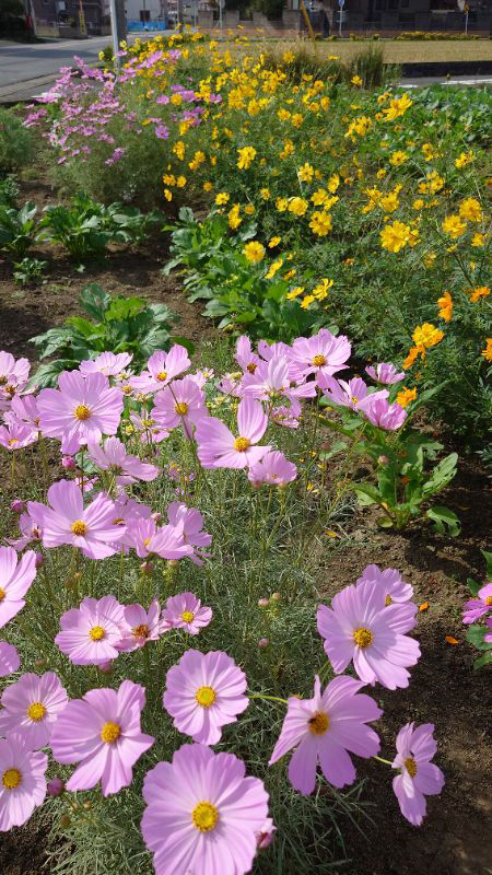 町中にはピンクや白のコスモスよりも、キバナコスモスのほうが多く、キバナコスモスへの訪花を見る機会のほうが多いです。並んでいたらどちらが人気なのか、、、?