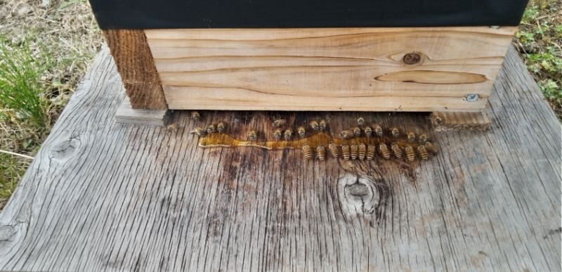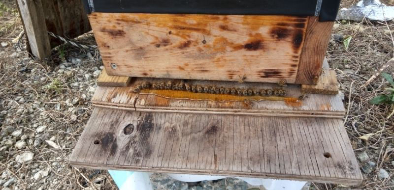 今朝、巣箱を減らそうと持ち上げただけで攻撃を受け、その後バタバタと死んでいきました。巣箱を開けるのは怖いので、薄いトレーにはちみつを垂らしキッチンペーパーで押さえ込み、それを巣門に突っ込んでいます。上からも垂らしましたが、底板もないものなので、他に方法がありませんでした。しかしもう食べる元気もないように感じます。