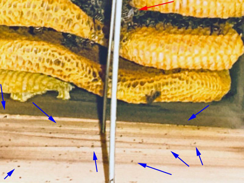 赤矢印の蜂娘は、不鮮明で正確ではありませんが、お腹が縮んでいる気がします。残り蜂は、お腹が空いているかも知れません。すのこ上部からの給餌をしてあげたら如何でしょうか。