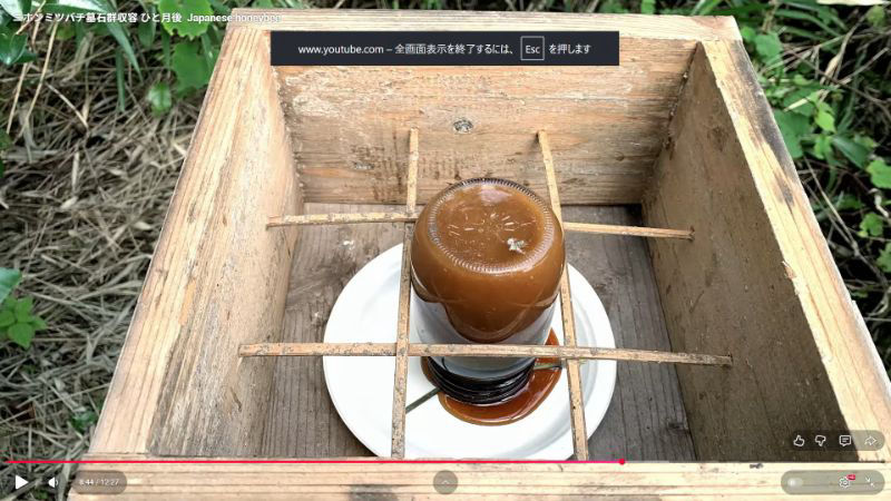すぐに蜂たちが大騒ぎで舐めとりはじめ、パニックか外にもたくさん時騒ぎのように飛ぶことになりました。上記写真2枚目のように巣箱内壁面やおそらく巣板をつたって底板にまで滴ってしたので、底板は水でながして掃除をしました。