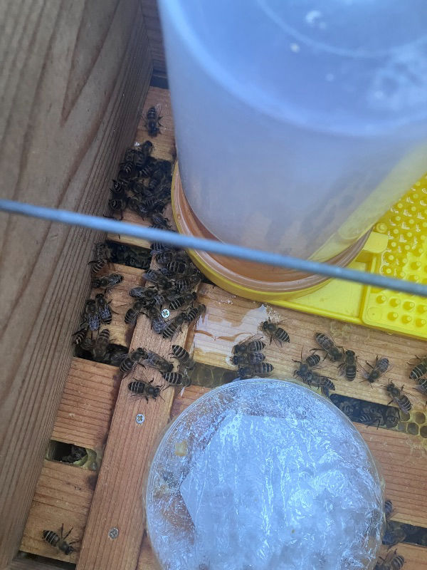 すのこ上に作った給餌室に昨日16時ごろ糖蜜をおこうとした際、写真の巣落ち防止棒をくぐらせるときに、かなりの量の糖蜜をすのこにこぼしてしまい、隙間から巣板、巣箱内壁面、蜂たちにかけてしまいました。三分の1くらいは給餌器に残っているので三分の2はこぼしました。完全に私の責任で猛省しています。