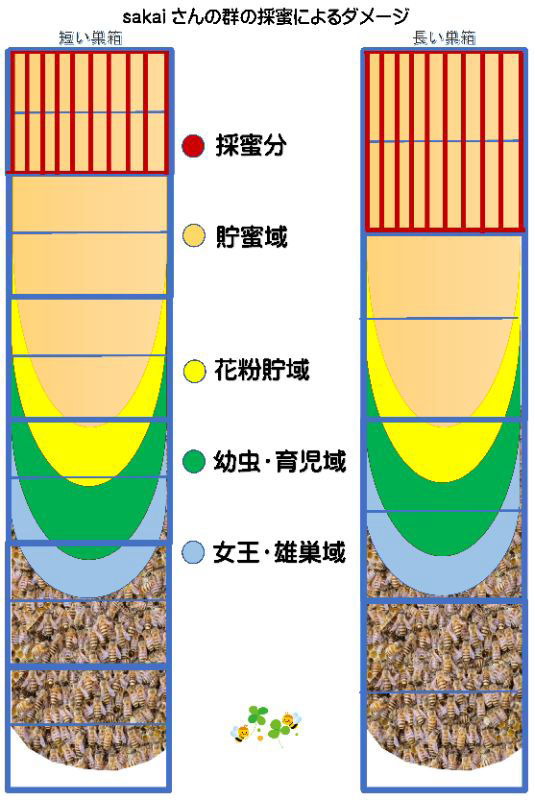sakaiさんの巣のイメージ図を見ると判りますが、同じ長さの巣板が伸びたとして、18cm高の巣箱4段だと、1段採蜜してしまった時のダメージがスゴイです。蜂蜜を採る事が目的ならば、それだけ多くの蜂蜜を人間がゲットできますが、ミツバチにとっては、物凄いダメージになります。それが12cm高の巣箱6段ならば、1段採っても、未だ残る蜂蜜が多いので、ダメージも少ないという事です。