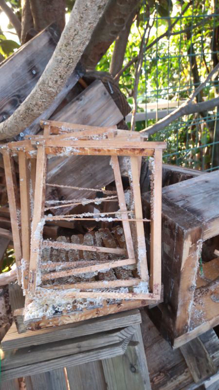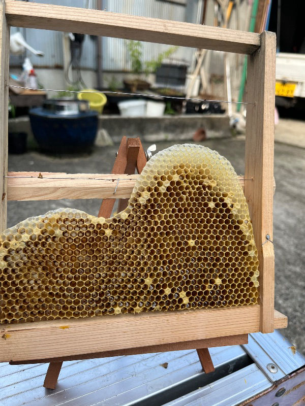 巣枠式では巣落ち防止の針金(太さ1mm未満)に蜜蝋を塗って、蜂の針金忌避を防ぎます。ただし、蜜蝋を塗っても針金を嫌い、造巣を避ける群もあります。