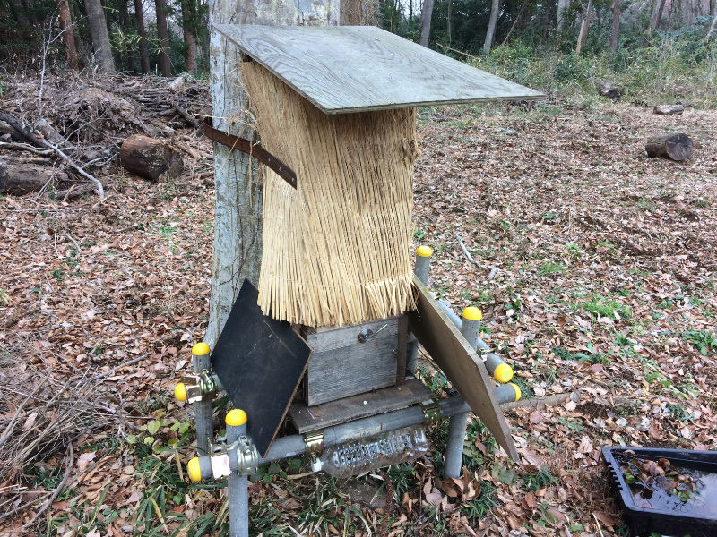 この巣箱は巣板がなく、1番下が地面になりますので、下には死蜂がいっぱいで、他のものを観測できません。困ったものです。