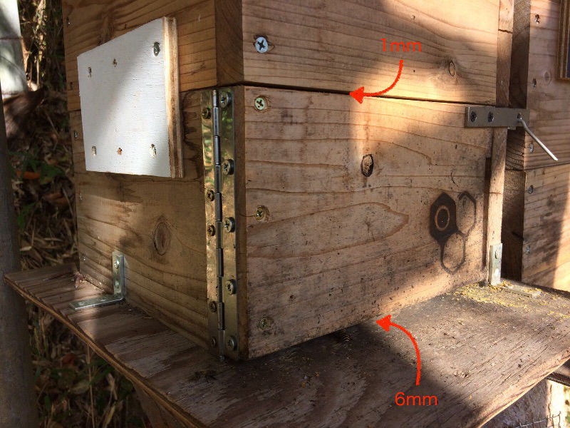 この作業を定期的にするためには巣門箱の扉が全開放できると便利です。重箱の1面を取り外し、蝶番(できれば一列全部のピアノ蝶番)を付ければ即席の扉ができます。当然、巣門の隙間6ミリ分は板の高さを短く切り直します。そして上にも1ミリの隙間を作ります。理由は、上にも少しの隙間を作らないと、開け閉めの際に渋くなるからです。したがって板高さはトータル7ミリ短くし、1ミリ下げで蝶番をビス留めします。