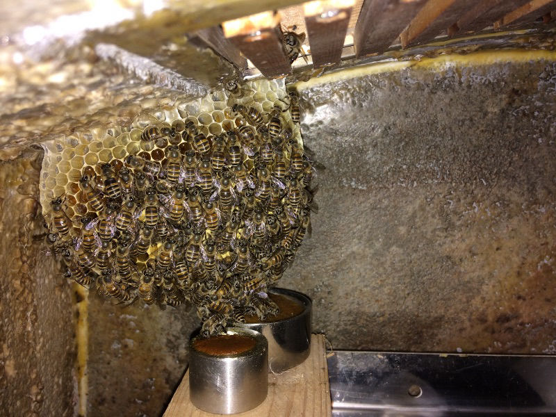 寒い時期の緊急給餌は蜂のいるところ(できれば峰球の最下部に触れるくらい)に餌を近づけないと食べてくれません。この巣箱の場合は巣落ち棒に触れるくらいのところに、直径10センチ程度の平皿に蜂蜜を垂らし、その上に4つ折りにしたガーゼを乗せてあげると染み込みますので、その状態で3日に一度くらいで様子を見ます。巣落ち棒にガーゼがめり込むくらい、下から押し付けるように、皿の高さを繊細に調整します。蜂が餌に気付き、食べ始めると小皿なら数時間で蜂蜜を吸い尽くします。皿の下にホカロンを置いてあげると温い餌が持続します。10パーセントくらいお湯で薄めても良いです。ガーゼをしないで蜂蜜だけだと蜂が溺れてしまいます。