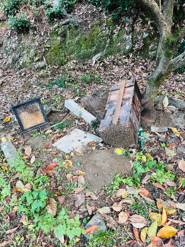 私の群れは熊に襲われました。そのうち一つの群れはその後行ってみると散乱した巣箱の中にほんの少しだけ蜂球が残っていました。綺麗な蜂球だったので、女王は無事だと思い、ゆっくりそのまま別の場所に移し他の巣箱も加え、蓋をして給餌をしながら見守っています。熊にボロボロにされてしまった断熱材で巣箱周りを囲ってあげて…