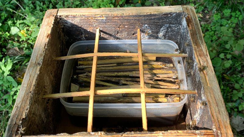 そして秋の時期の給餌は砂糖6に熱湯4か砂糖2に熱湯1くらいで作った濃いのを巣箱の中に給餌器を置いてやるのがいいです。もし最強群で貯蜜が全くないのなら数キロの糖液の給餌が必要です。