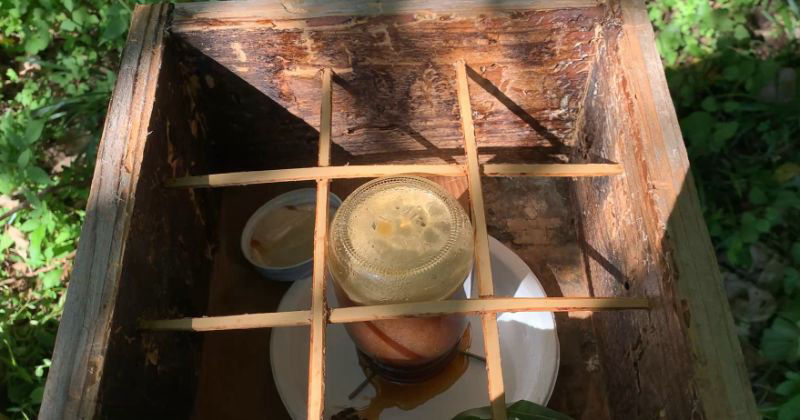 写真では巣箱の外で給餌しているので、今までは無事だったようですが、別の群に嗅ぎ付けられれば盗蜂が始まり、大混乱になって死ぬハチが出るので目を離さないでやるのならいいですが、この方法は大変危険です。特にハチミツの給餌は匂いが出るので非常に危険です。