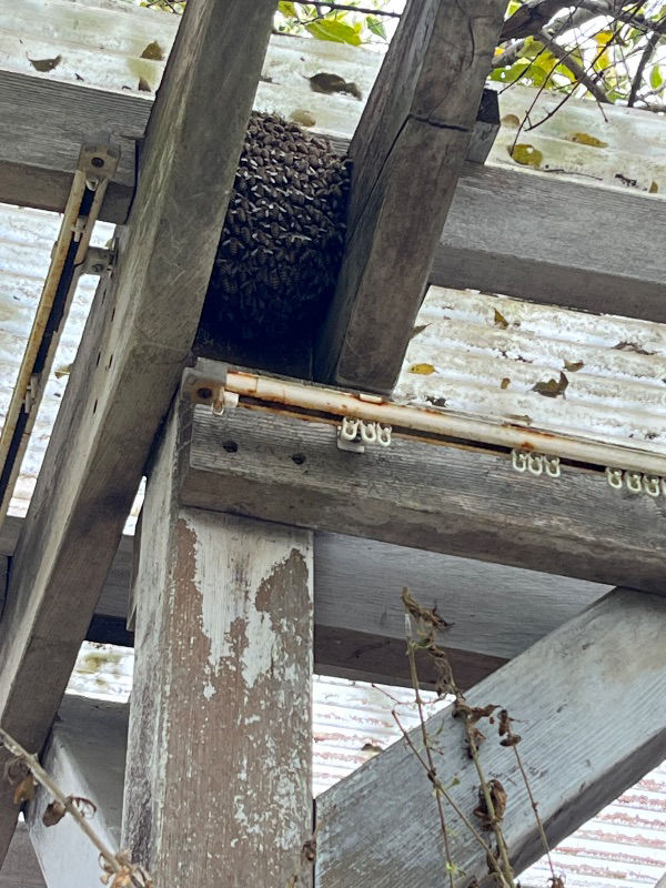 蜂球が形成されるのは、分蜂、逃去やこれに伴って入居する先で(今回みたいな開放空間のこともあり得ます)などですから