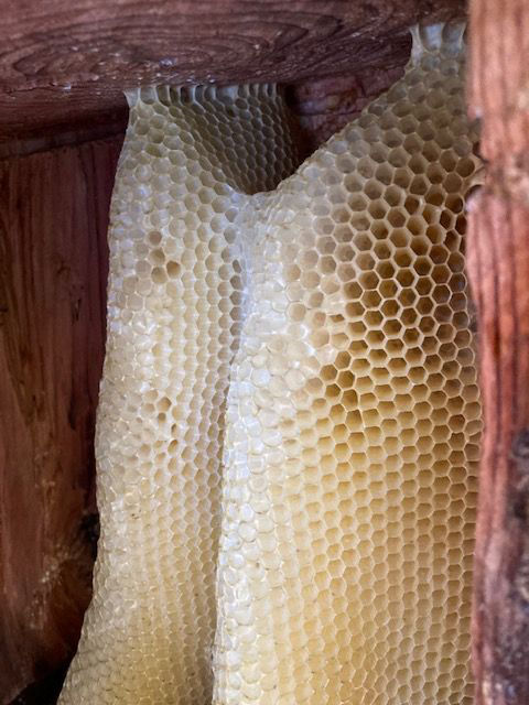 これは丸洞の盛り上げ巣ですが、上に空間があればミツバチはその場所に盛り上げると理解しています。