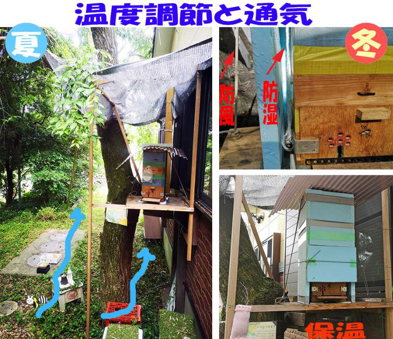 外部からは、スタイロフォームで防寒防風をします。木箱にピタッとはくっつけず、湿度が抜けるようにしながら、外部の風が直接当たらないようにする。巣門も狭くする。