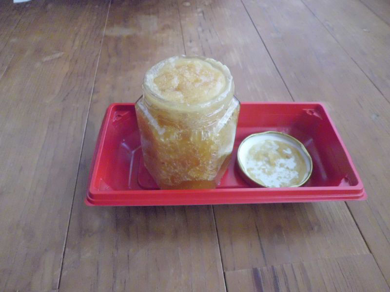 昨年の絞り蜜を給餌用に瓶詰めしたのを忘れていて先月発見し、蓋を緩めた途端に結晶化した蜜が発酵していて吹き出しました。
