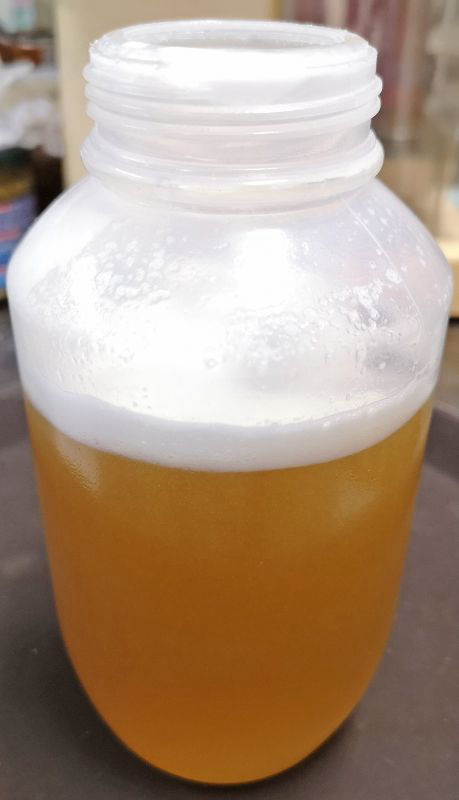 蜂を飼い始めたころ、採密の時期がわからず適当に採密して水分が多かったので発酵しました。ちょっと酢味がりましたが、甘酸っぱい味もまた良しと頂きました。