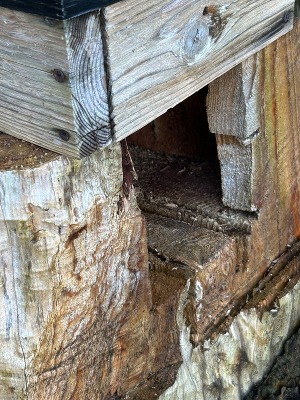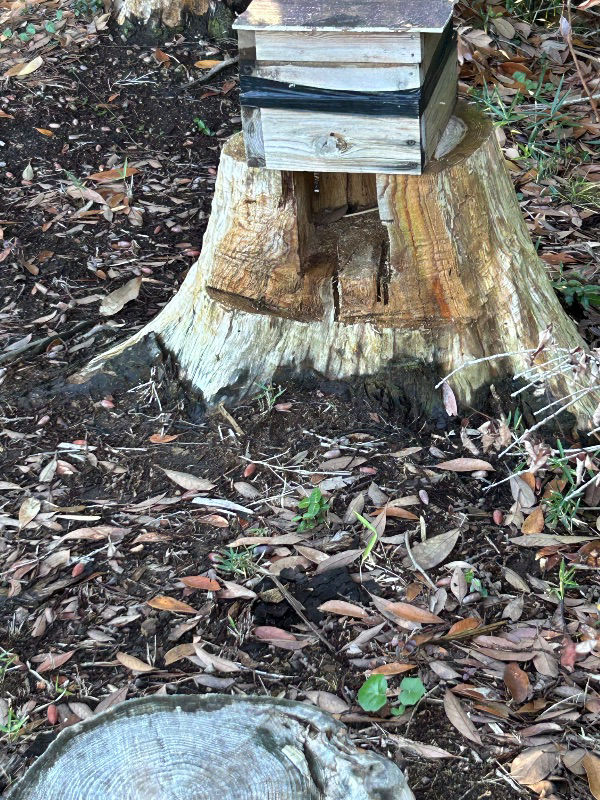切り株の中は繰り抜いていません。切り株側の上面(箱の下面部)に外周から中心に向けてⅤ溝のように加工しています。この溝が蜂の入り口になります。探索中や入居後も概ね入るときはこの溝から、出るときは箱下部の巣門から出るという一方通行にほぼなっています。ということで待ち箱とセットで確保用にこの切り株を利用するつもりでしたが、入居後もそのまま使用しています。巣門枠と切り株の間に通り道用に切り欠いた穴あき板を入れているですが、固定しているので底面の掃除ができません。今のところ掃除できなくても特に支障はありません。切り株が箱の数分必要になるので友人に依頼してます。←結構大変!