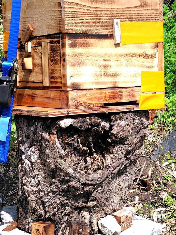 結局、下に重箱を接着し、ハイブリッドにしましたが、長い洞の中にスムシが入り込み、対処する事も出来ませんでした。結果的には、逃去に繋がってしまったので、それからは、重箱式の蜂箱一本です。