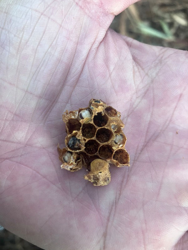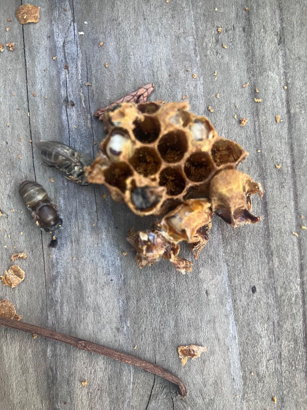 ①本日、少し気温もあたたかめだったので、底板を抜いて掃除し、内見写真を撮りました。そうすると、底板に齧り落とした小さな巣板がいくつかあったのですが、よくみると空ではなく、中に蜂児がいる状態のものでした。蓋をあけると蜂児がいました(下部写真参照)。蜂児が入ったままの巣板(巣房)をかじり落とすことはあるのでしょうか。何らかの異常が考えられますでしょうか。