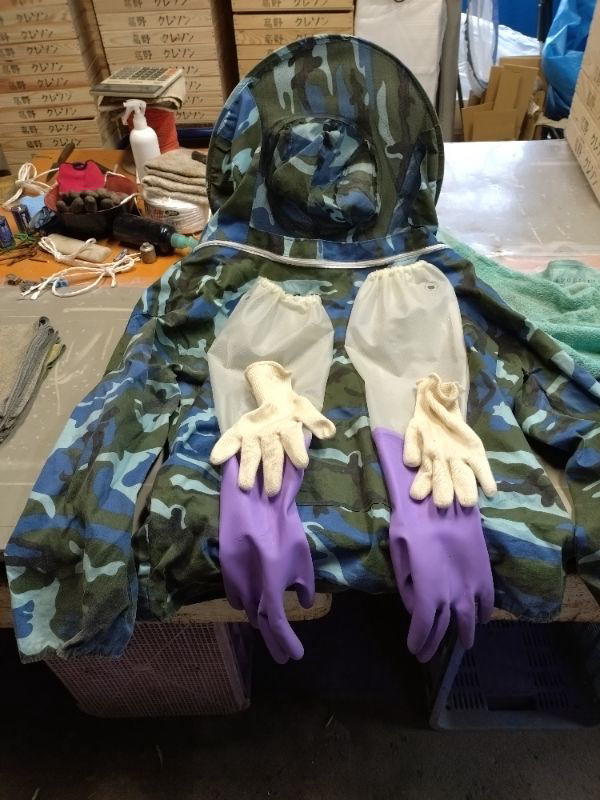 採蜜作業は防虫服、養蜂用長袖手袋 羊皮製を着用して作業ですが、防虫服は(夏場はメッシュ服)上着だけの着用です。