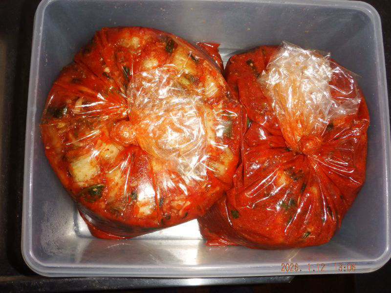 韓国キムチにも味を調えるのに使用しますね。左の白菜キムチに70g使い、右の大根(カクテキ)キムチには60g使用していますね。その時に有る蜂蜜を使用しますね。後は直接ラージースプーンで、蜂蜜だけ頂くことも有りますね。