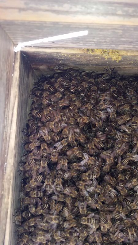 写真の黄色い巣クズが付いているあたりが4面巣門の位置になります。(底板ぎりぎりまで蜂が居ます)