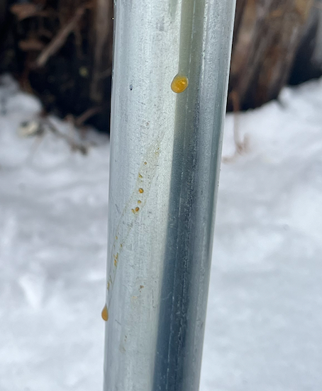 鉄パイプに残っていた糞は、写真のとおりほぼ液体状でしたが、こもやひもに残されたものは分かりにくいかもしれません。