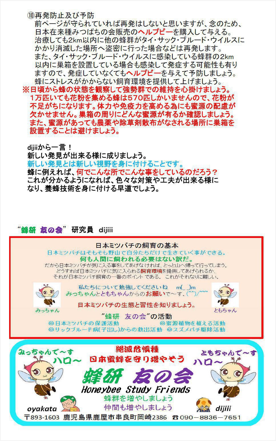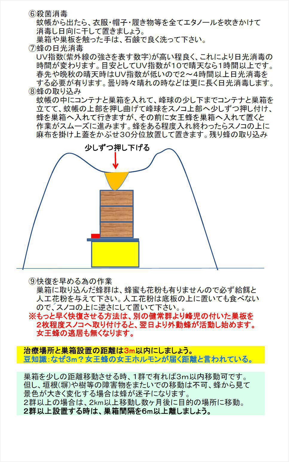 匿名さん福岡県朝倉市のonigawaraですが自分はハイパーブロックと言う介護士の方達が首にかけているものでウイルスを寄せ付け無いとの事なので底板に乗せていますがまだ結果は分かりません。薬局で1200円くらいだったと思います。まだ実験中ですので結果は分かりませんがミツバチは逃げては行かないようです。ただウイルスには良いかも知れませんが農薬が混じった花粉等を幼虫がエサとしてもらい死んでいるのなら効果は無いと思います。 死んでいるから幼児出しをするのですから、僕は暑さ対策も幼児捨て対策の重要な対策と思っています。
