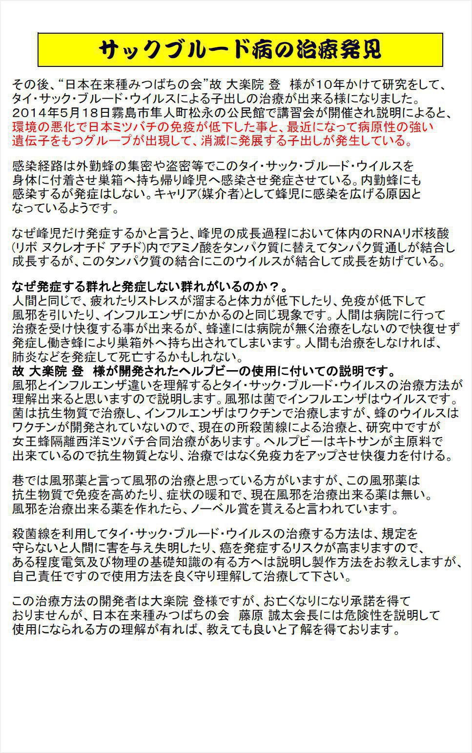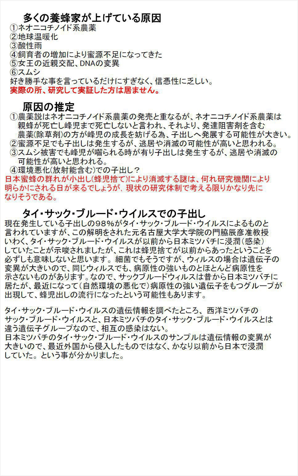 日本ミツバチは森林組合の友人から2012年巣蜜をいただいたのと山荘の薪小屋に日本ミツバチがたくさん来ていたので何か自分でも知らないうちにやっていました。宜しくお...